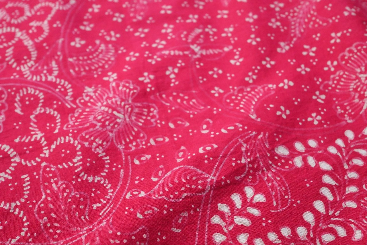 濃いピンクに近い赤1色のバティックは、モノトーンカラーの差し色に。無地感覚で使える良さがあります。お手頃なラッスムによくあるかすれ気味の描線に味わいがある1枚。