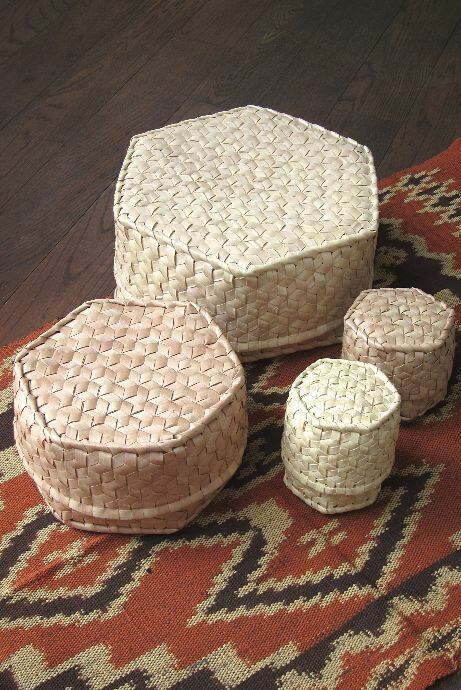 六角形の目が連なる編み目は、しっかりかたちを保って丈夫。また水にも強く、使い込むことで自然素材ならではの色味や風合いの変化が楽しめます。