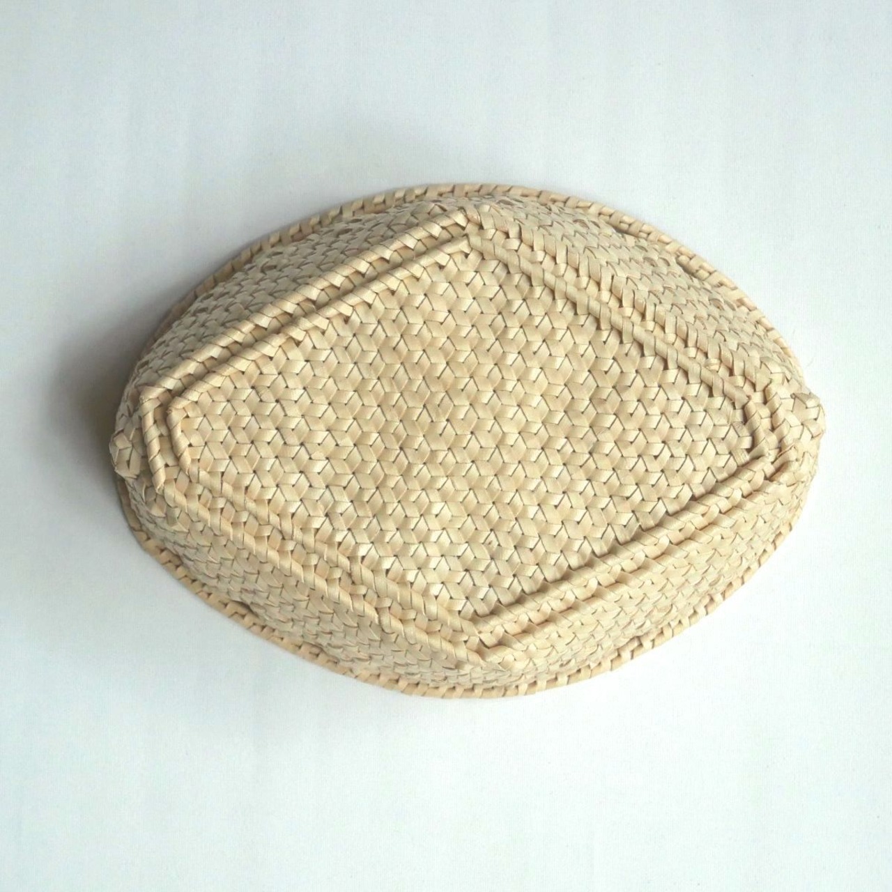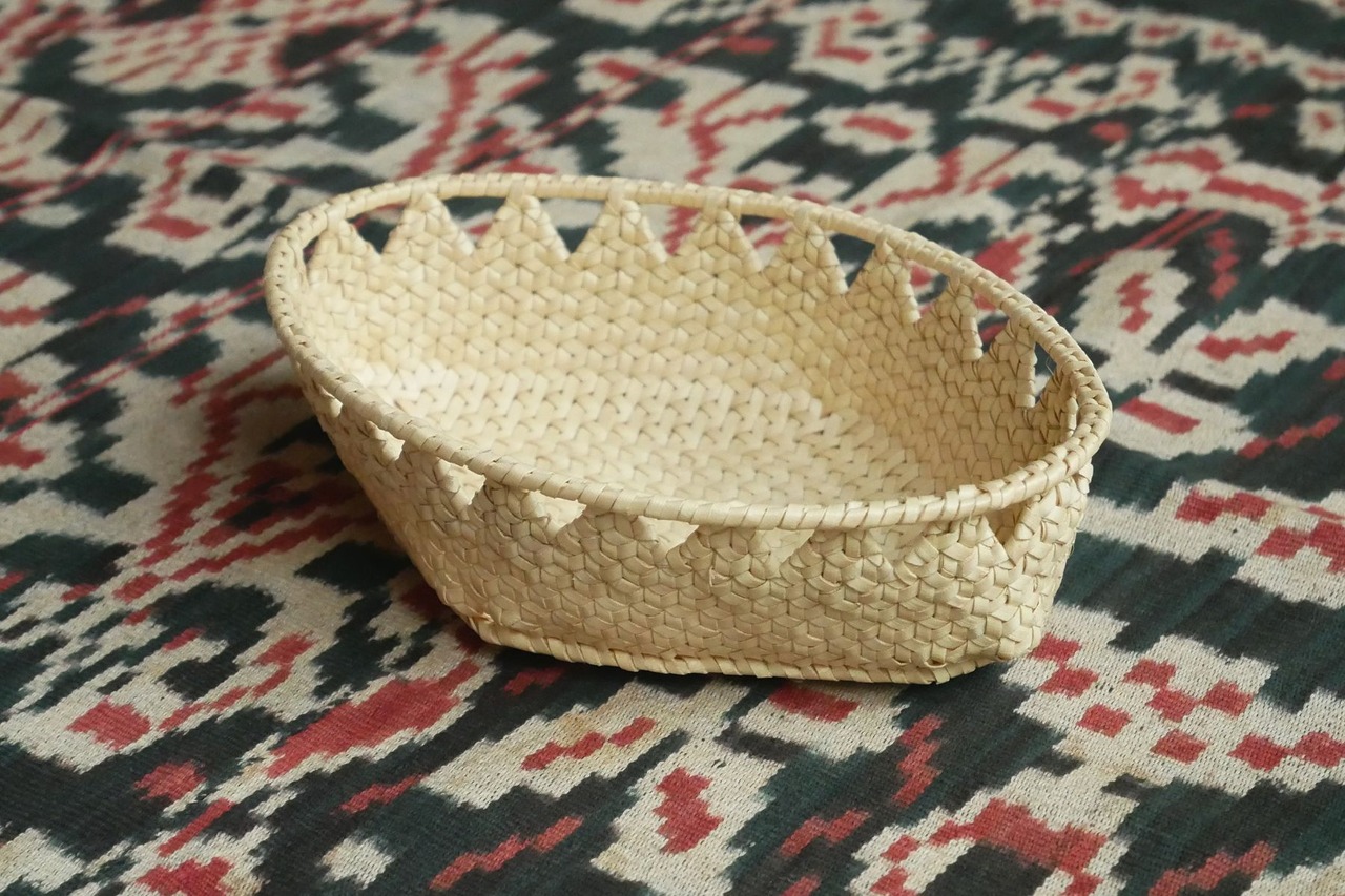 このトレイは、とりわけ繊細で細かく編まれるカゴ類が多いスンバ島の製品。洒落た菱形で、見ているだけでも心満たされる美しい編みカゴです。小さい物ですが、細く裂いた葉で丁寧に六角編みが施され、縁のギザギザの装飾もとてもきれい。