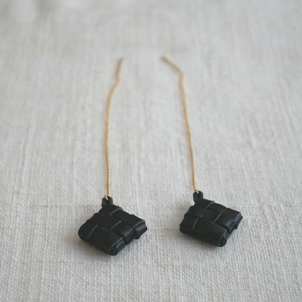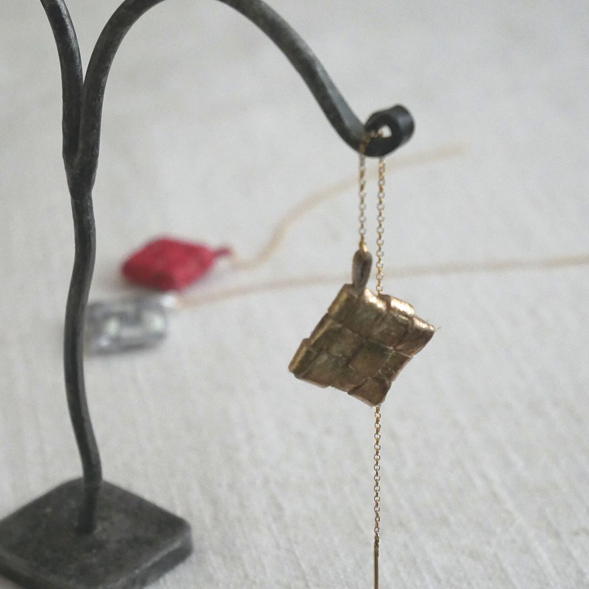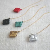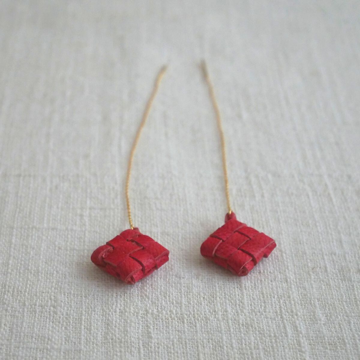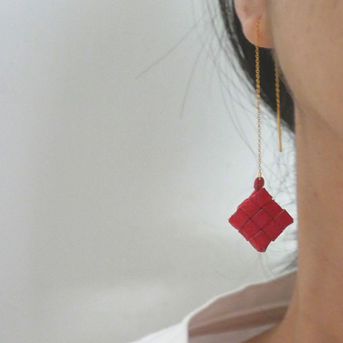 バリ島のウブドにある、手作りの革製品とアクセサリーのお店「nanan」から、ユニークなデザインのピアスをお届けします。この形は、椰子の葉を編んだカゴの中に、お米を入れて蒸したちまき「クトゥパット(またはティパット)」がモチーフ。山羊革のハギレを活用して編んだ小さなクトゥパットがかわいく揺れます。