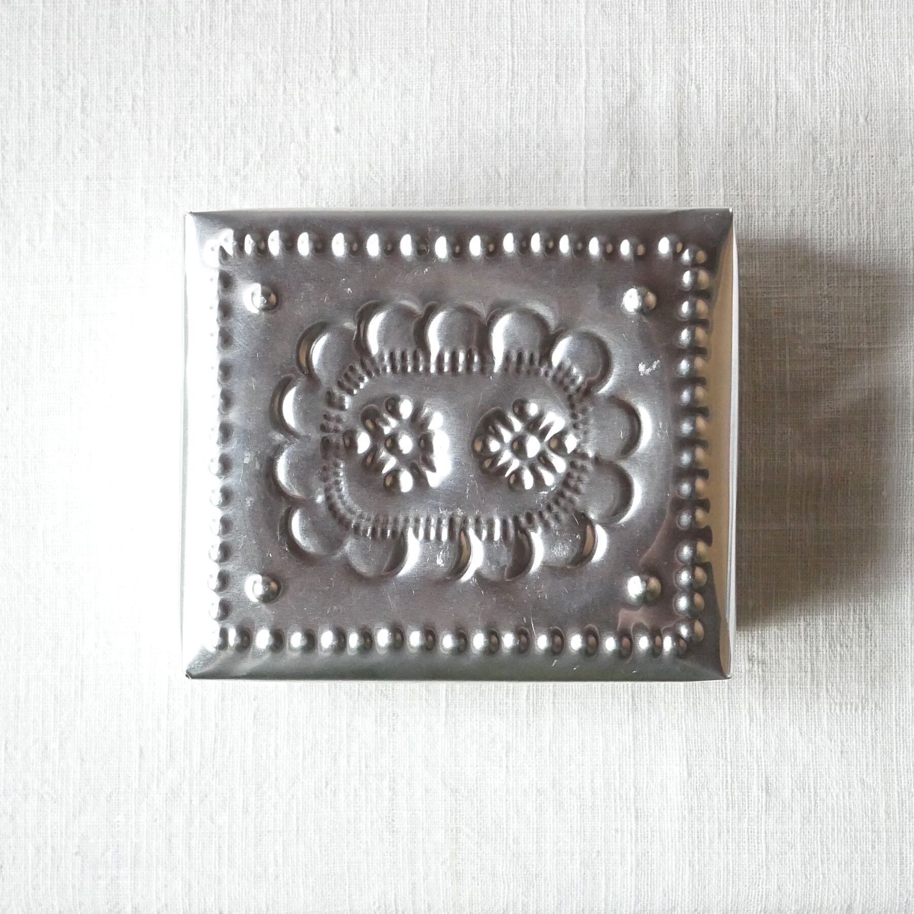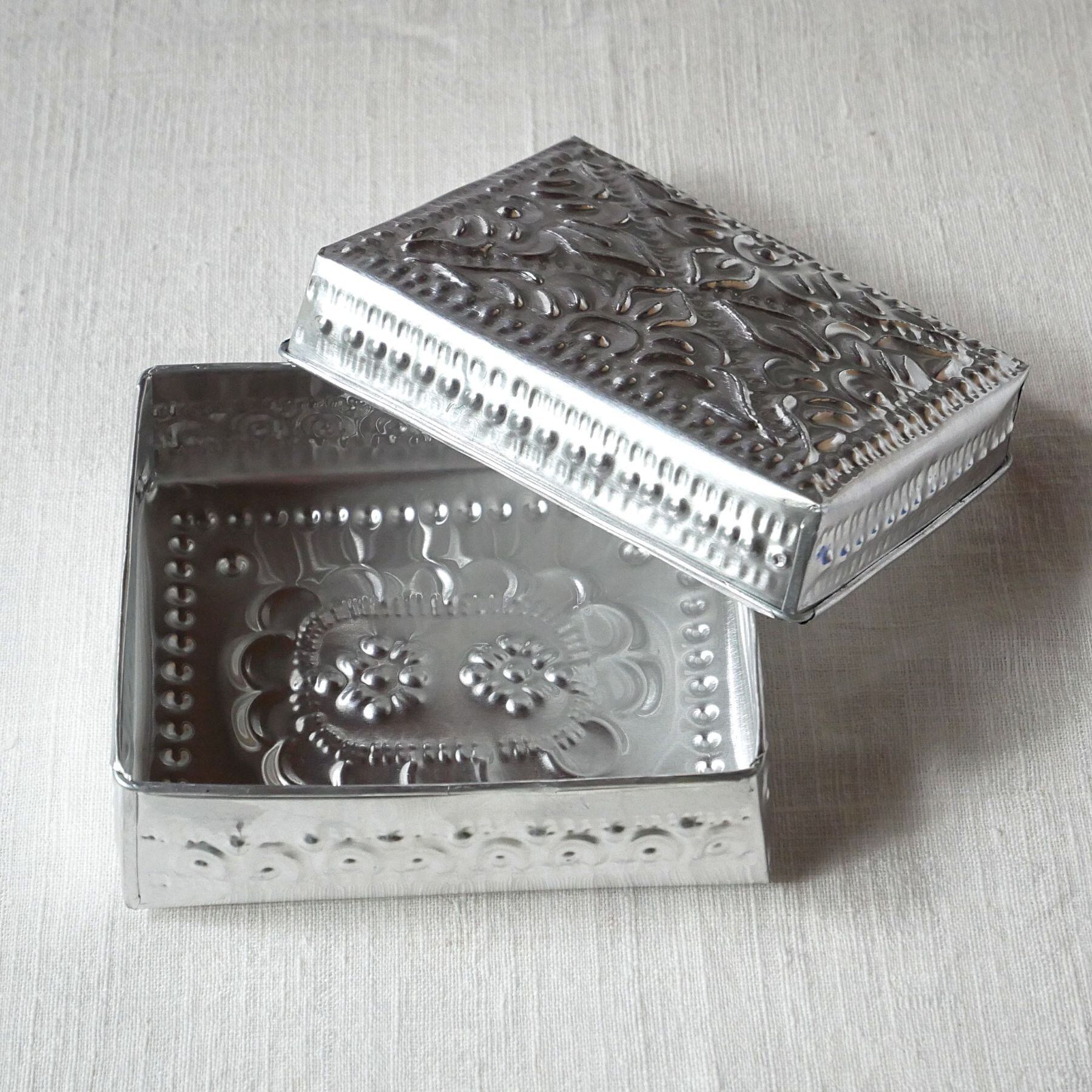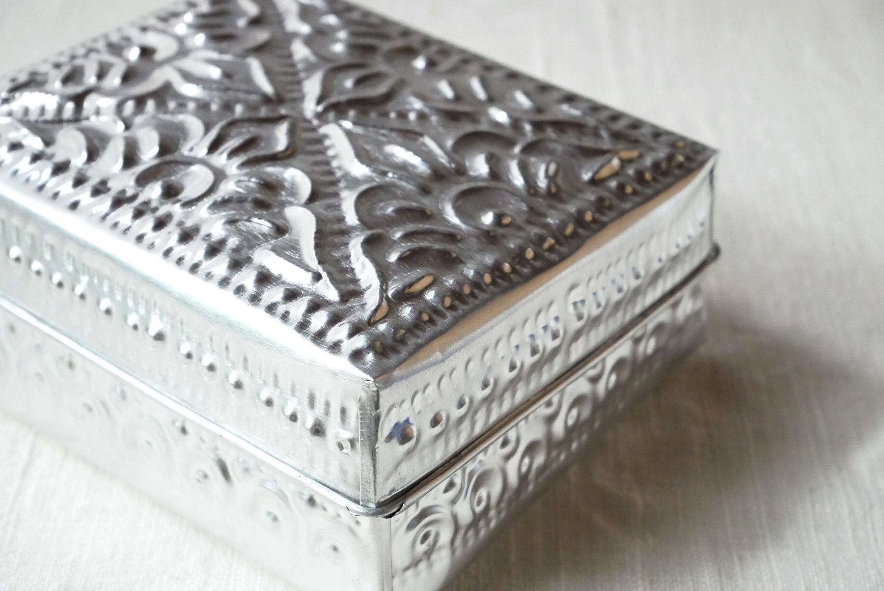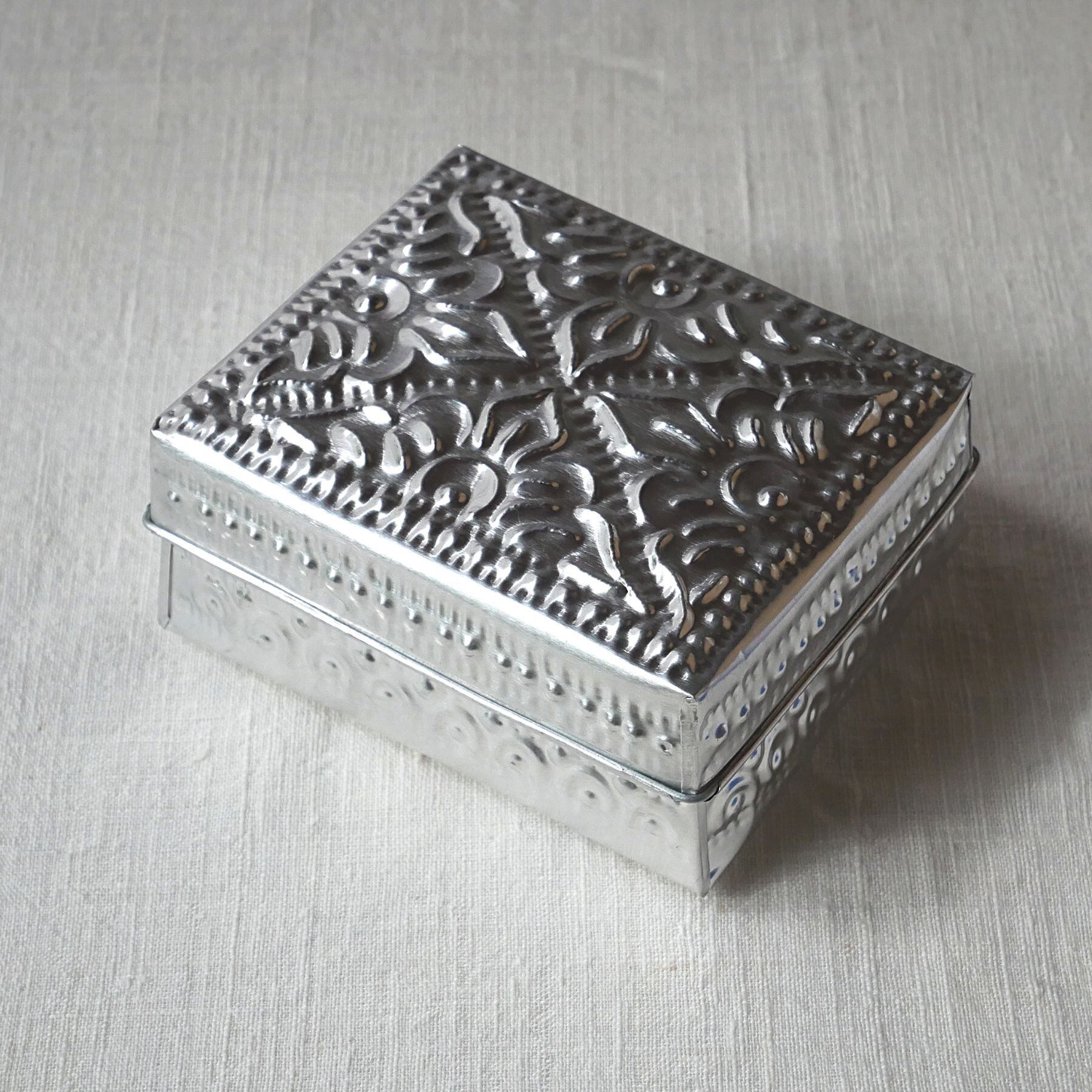 バリ島らしい模様が型押しされたアルミ製の箱。光沢がお洒落な印象と相まって、素朴な作りに温かみがあり、天然素材との組み合わせても馴染みます。底面にも模様あり。こまごました物の整理に。またギフトボックスとしても喜ばれそうです。