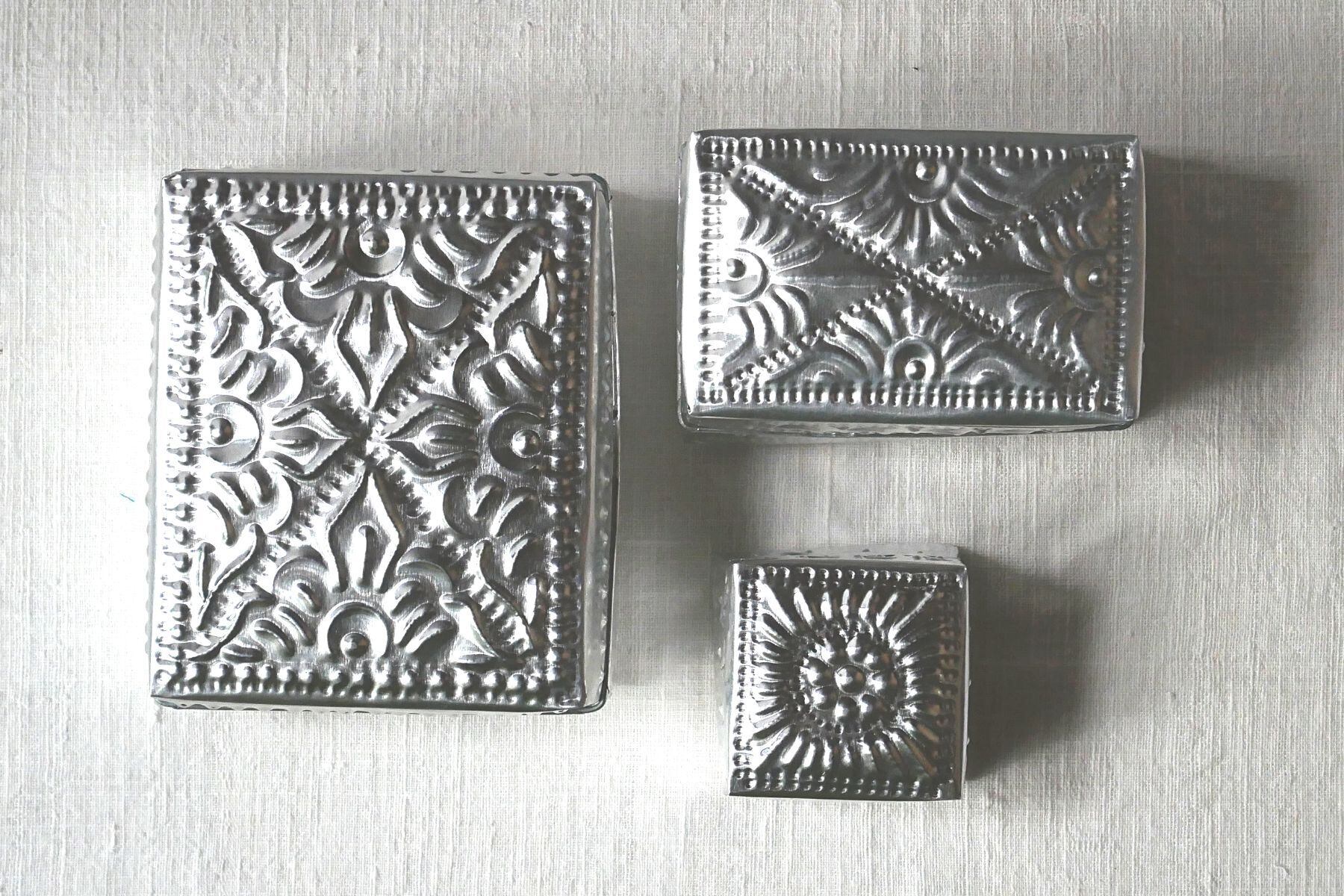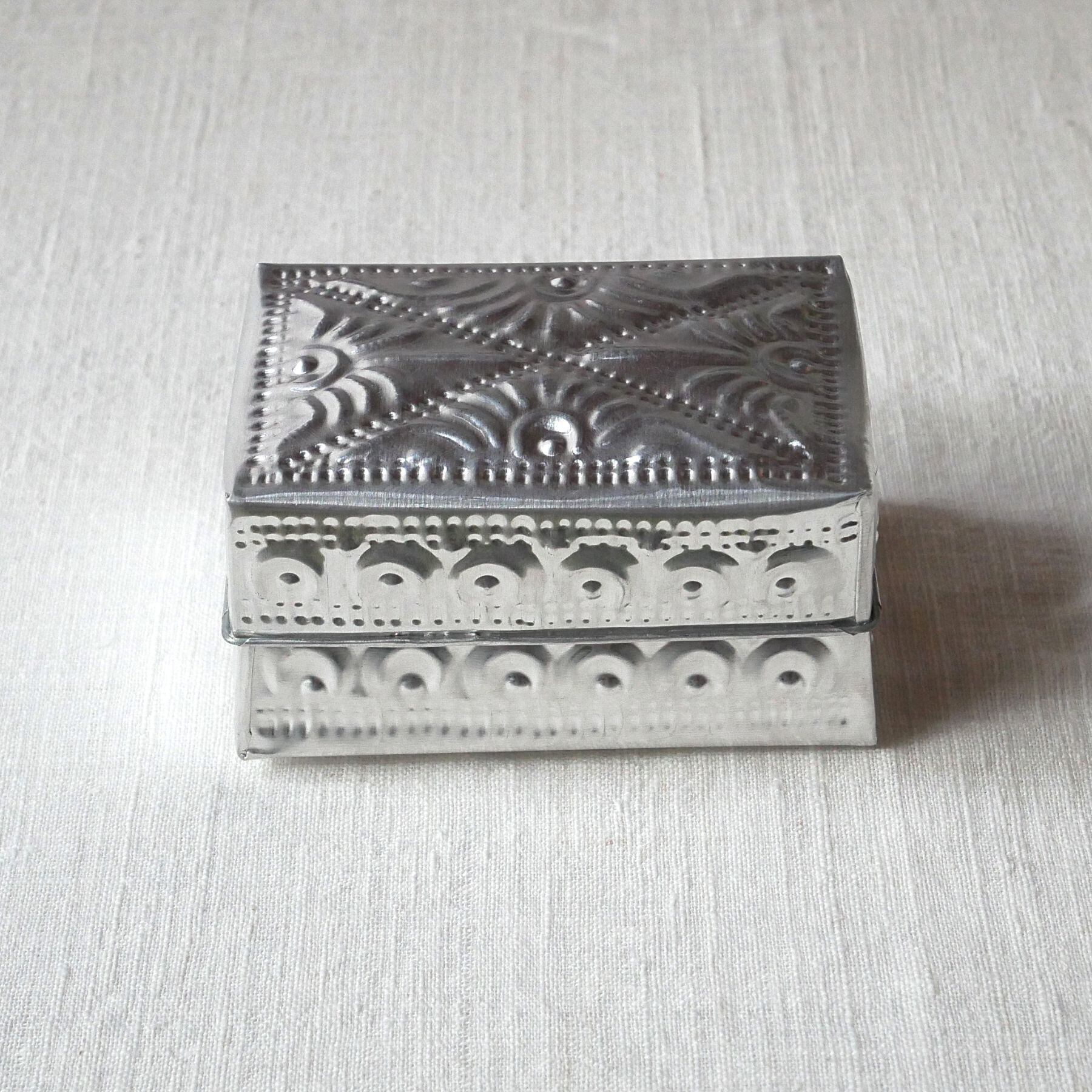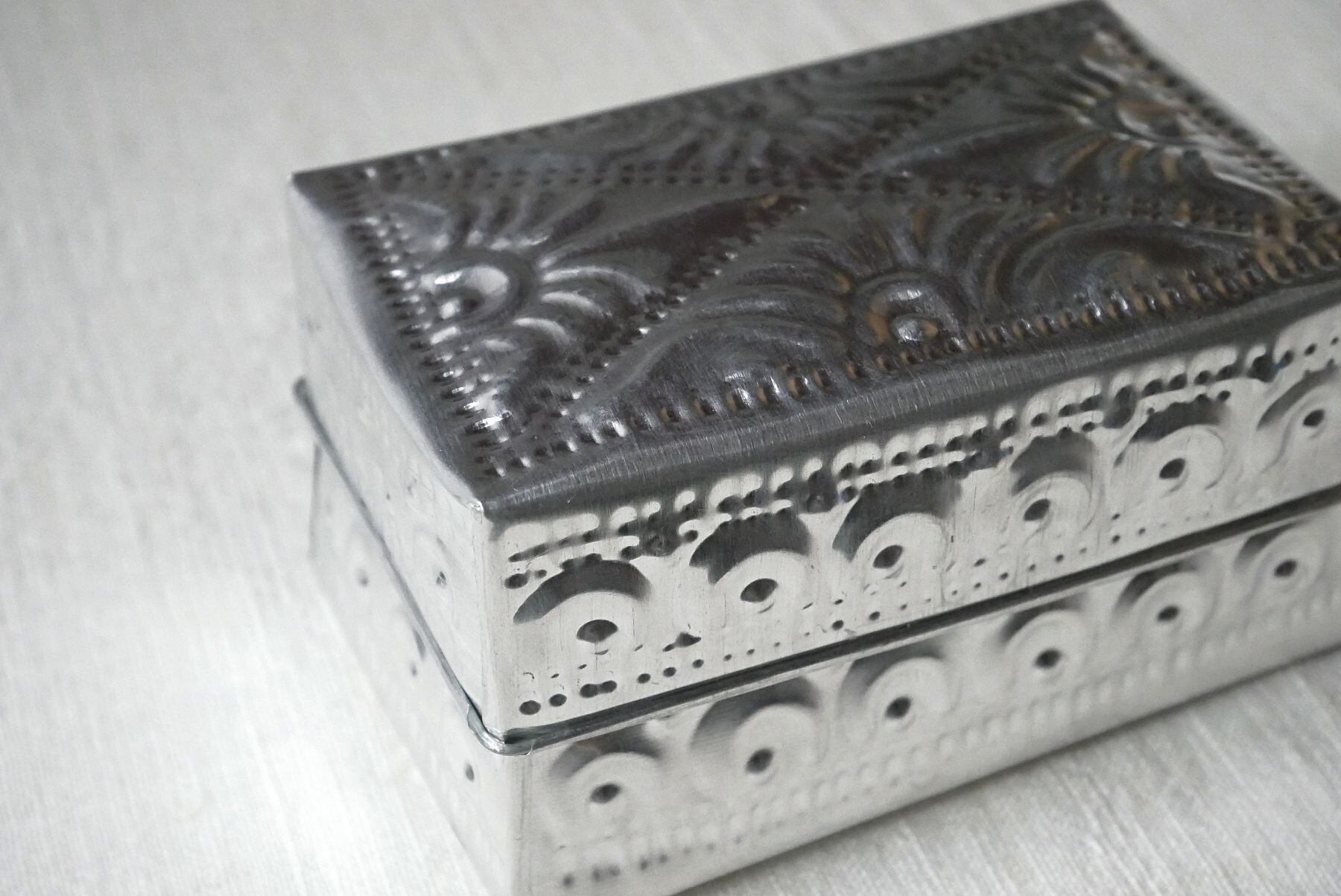 バリ島らしい模様が型押しされたアルミ製の箱。光沢がお洒落な印象と相まって、素朴な作りに温かみがあり、天然素材との組み合わせても馴染みます。底面にも模様あり。こまごました物の整理に。またギフトボックスとしても喜ばれそうです。