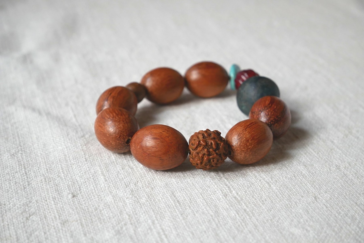 天然木、ルドラクシャ(ジュズボダイジュの実)、ターコイズなどをOUKAさんらしく組み合わせ、手元に多彩な表情をプラスしてくれます。