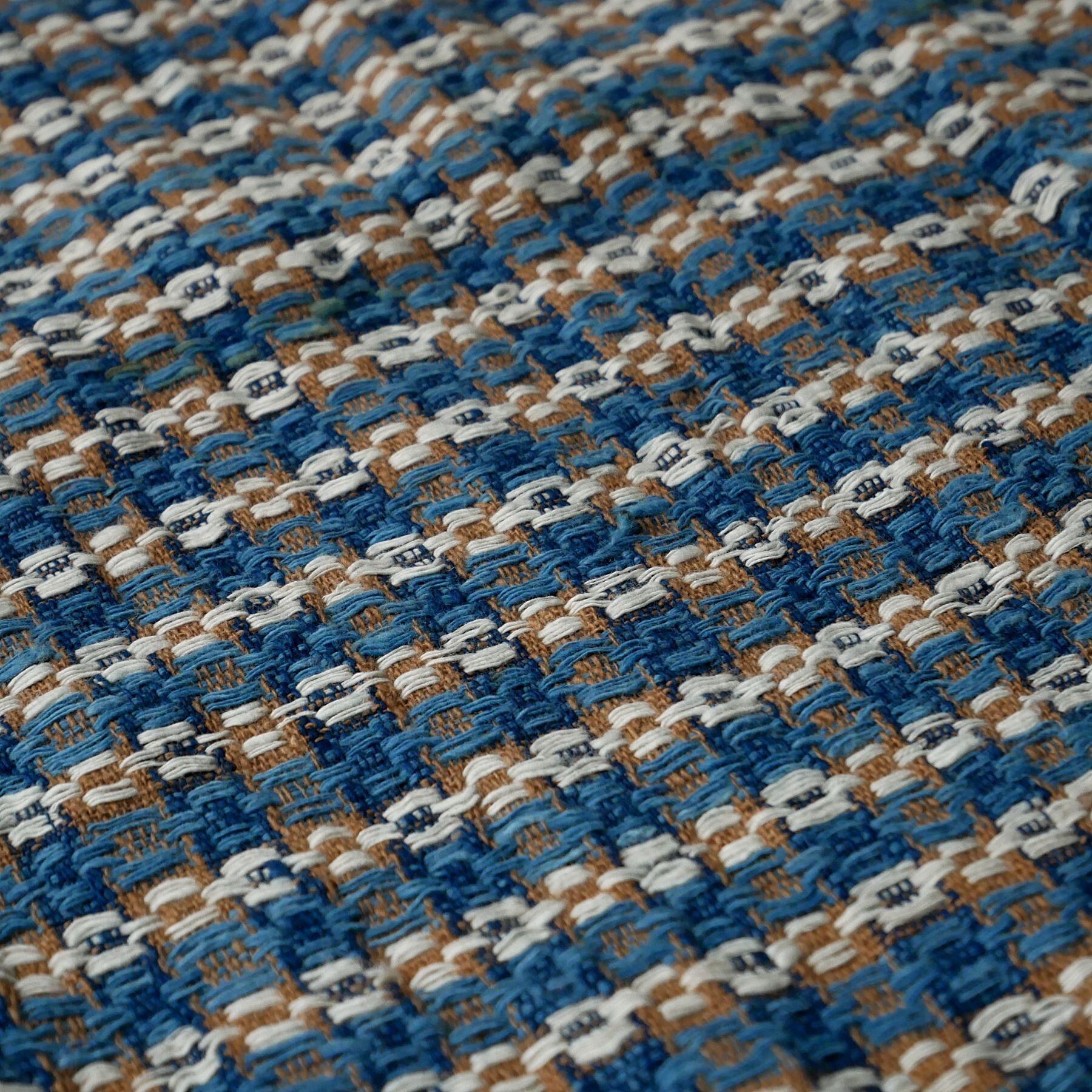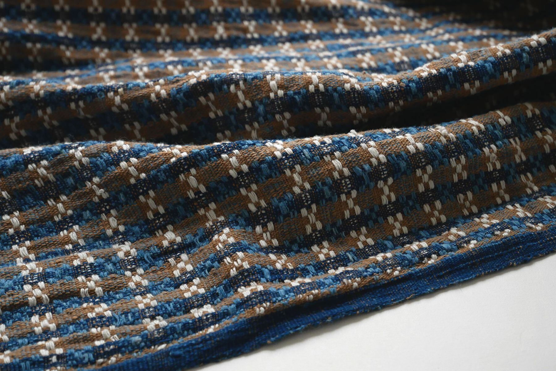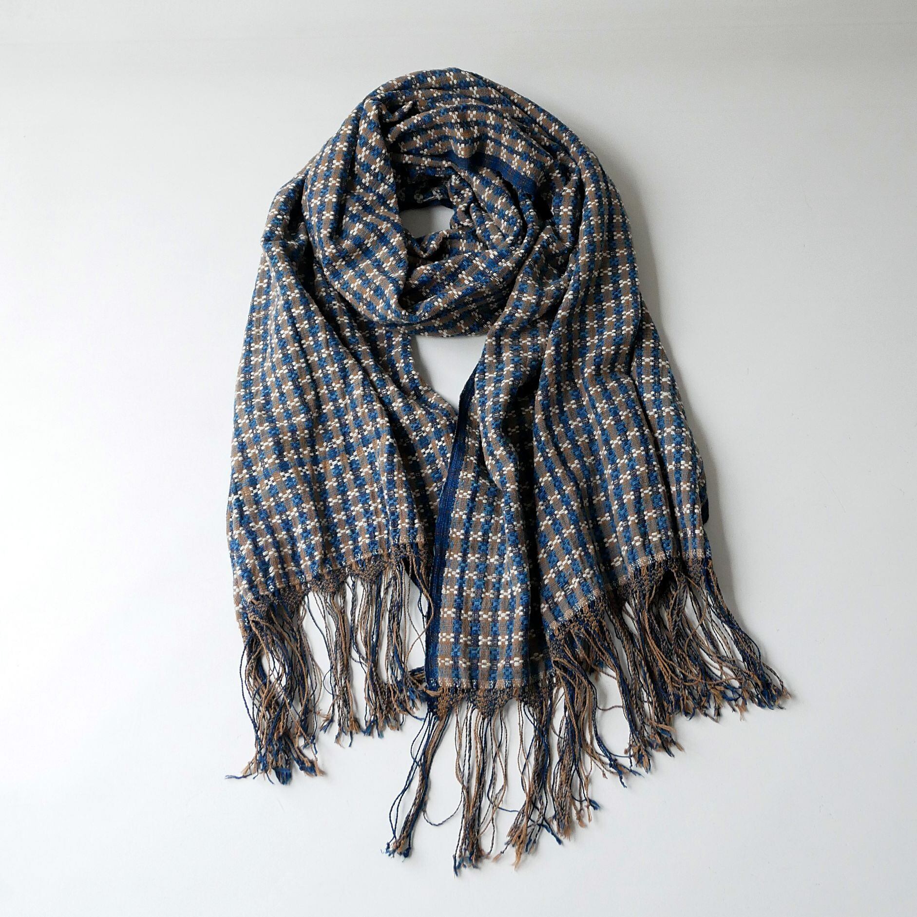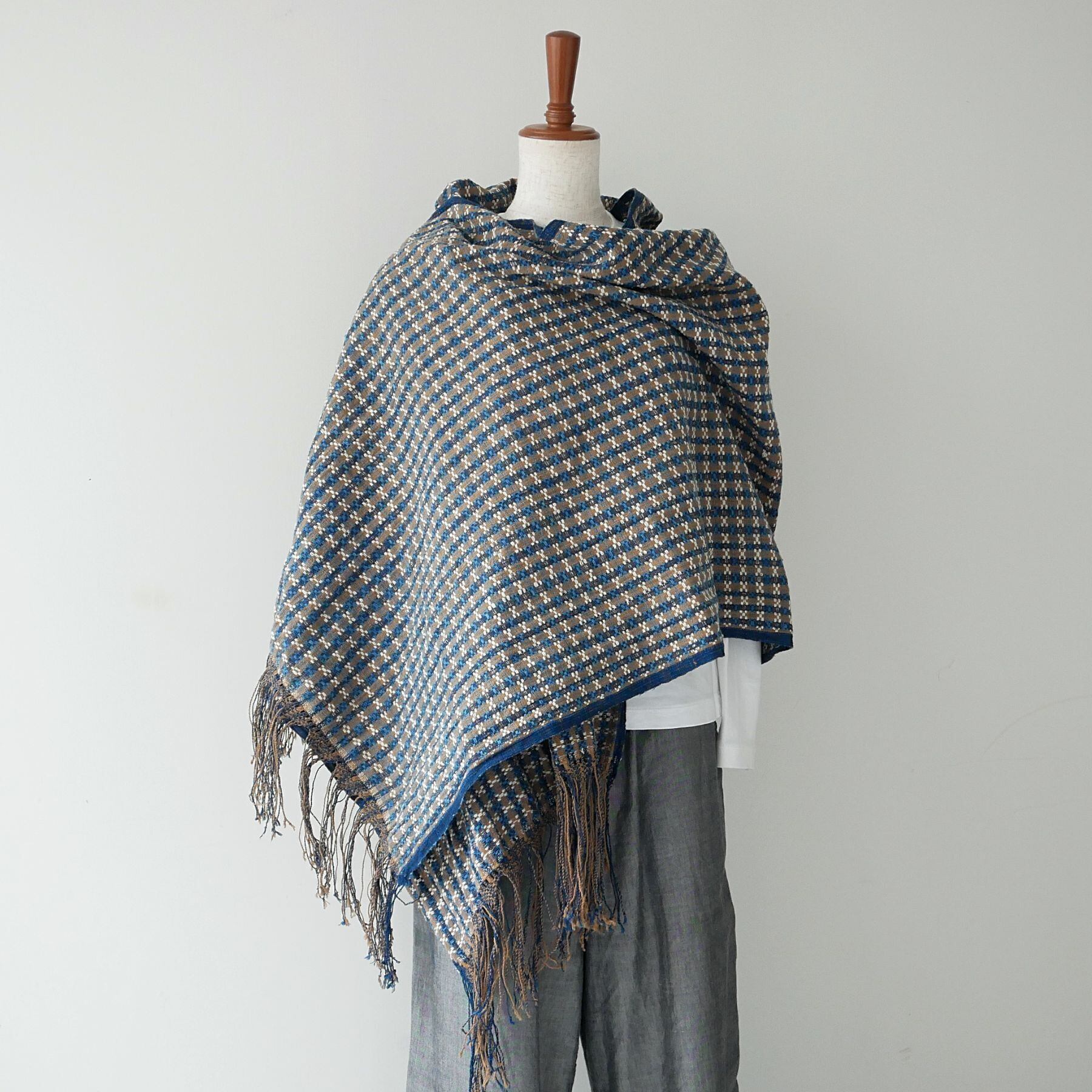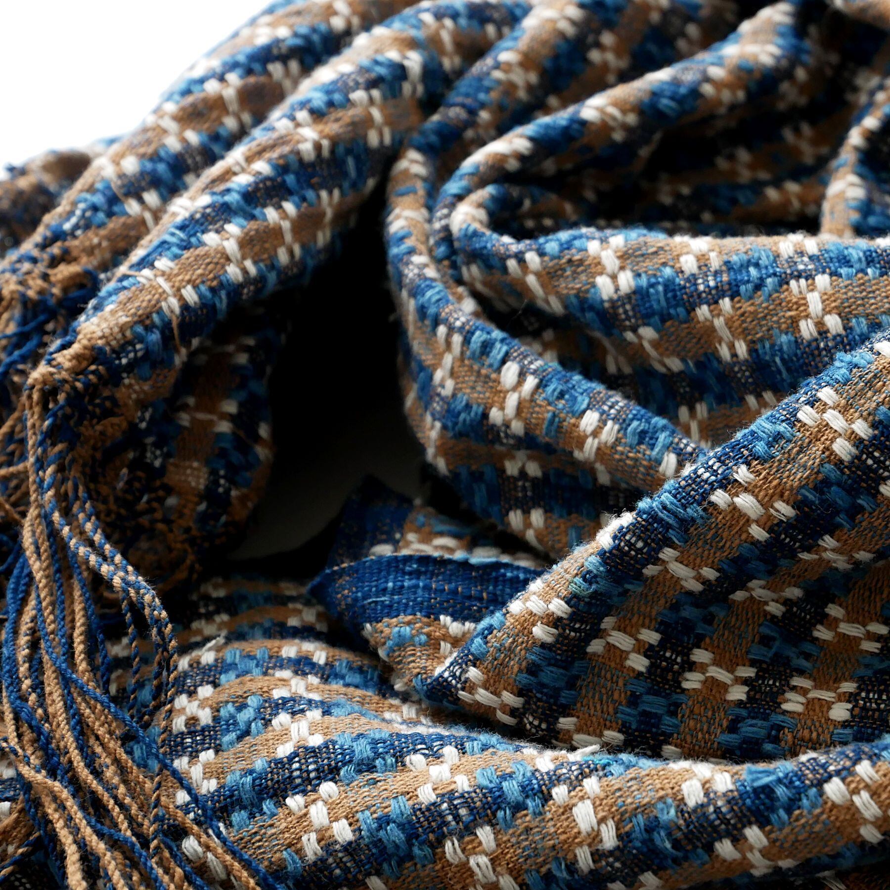 伝統柄をベースに、新たに創作した緻密な織りの模様を表現したこのストール。藍は、インド藍と琉球藍で染めた糸を2種、それに茶綿と、自然のままの生成りの糸を合わせ、織りあげています。