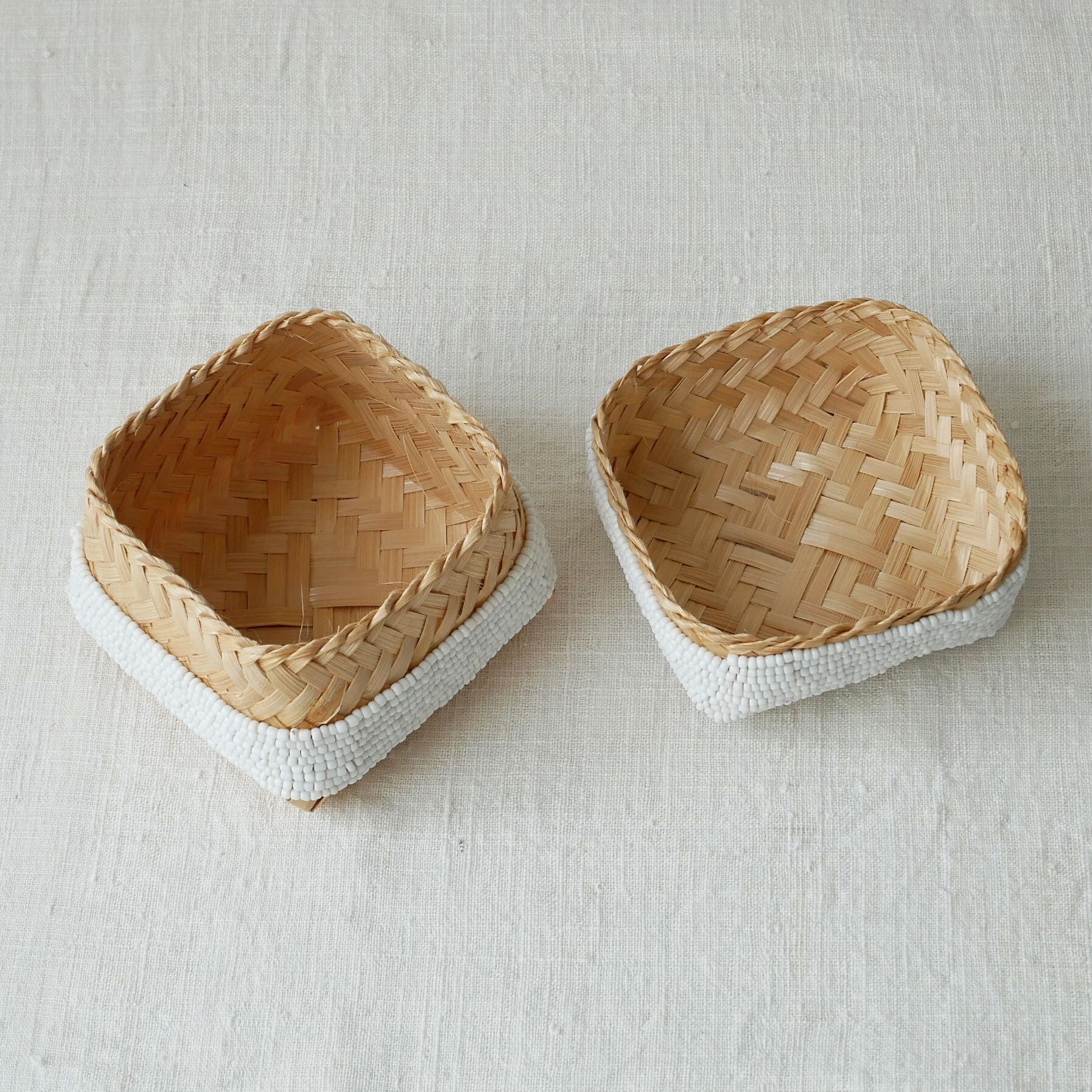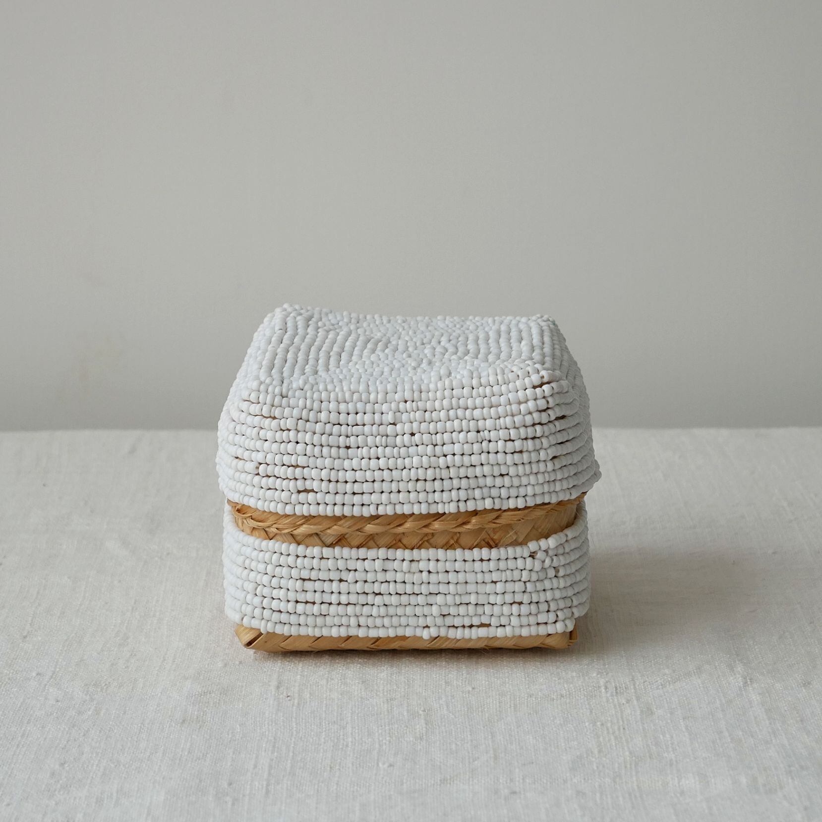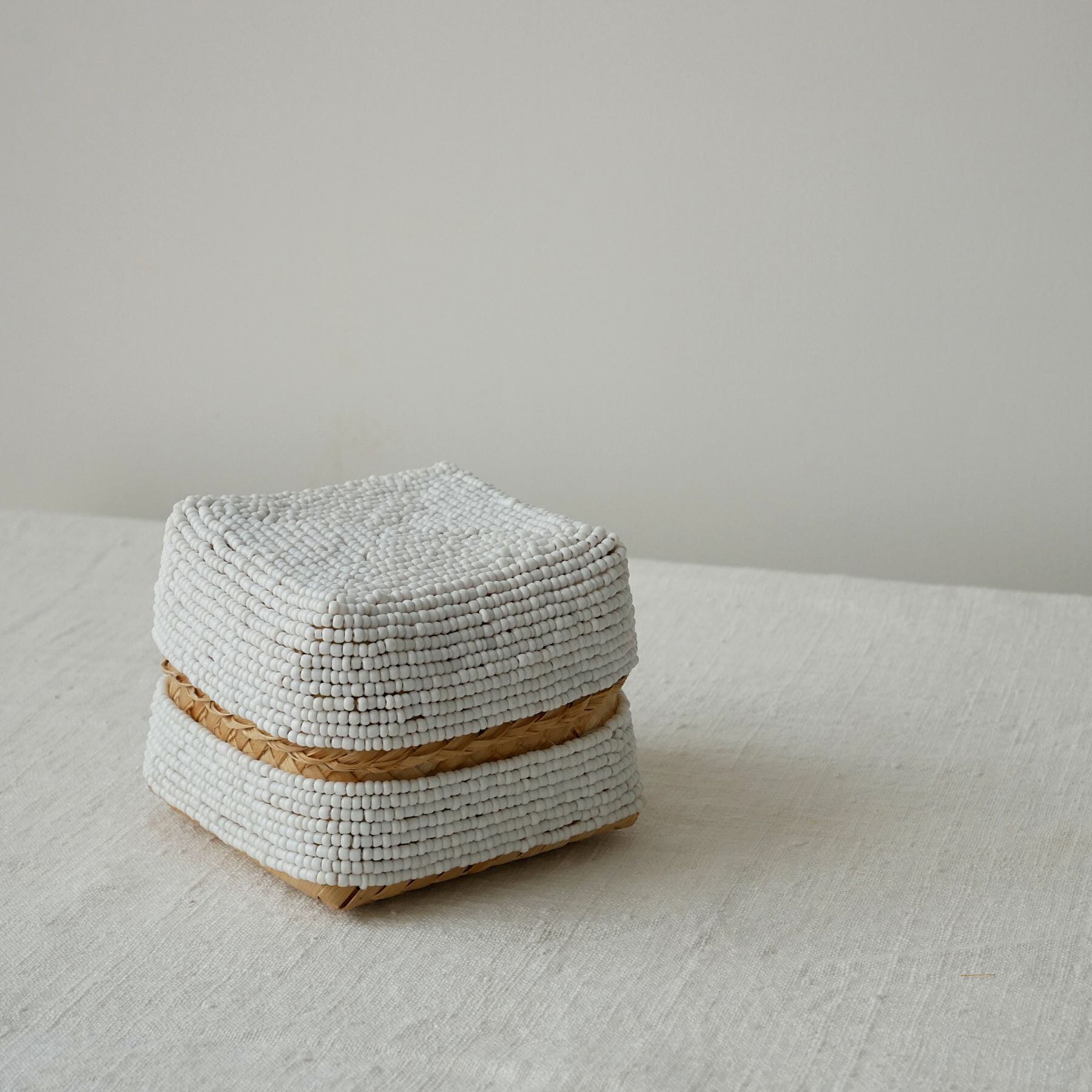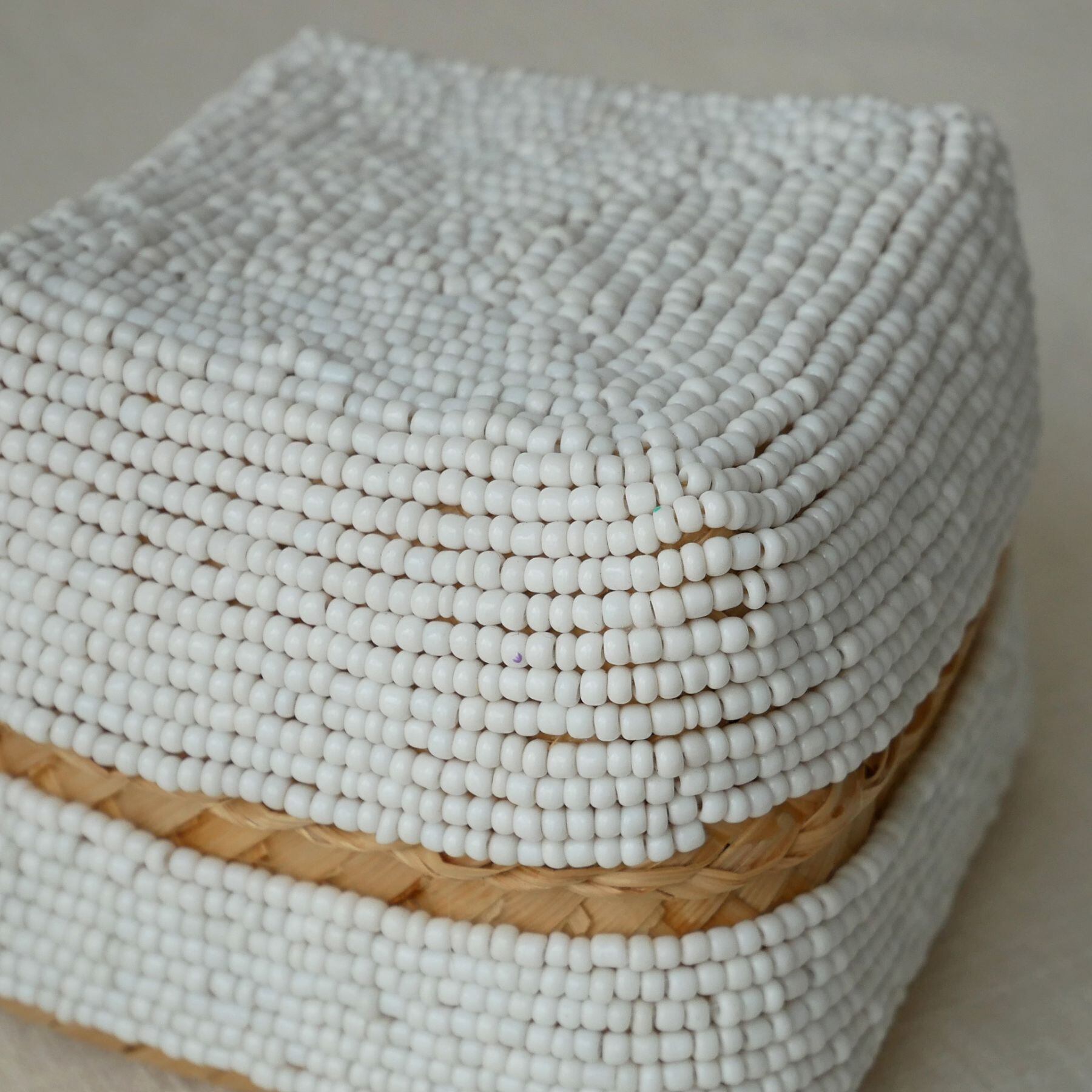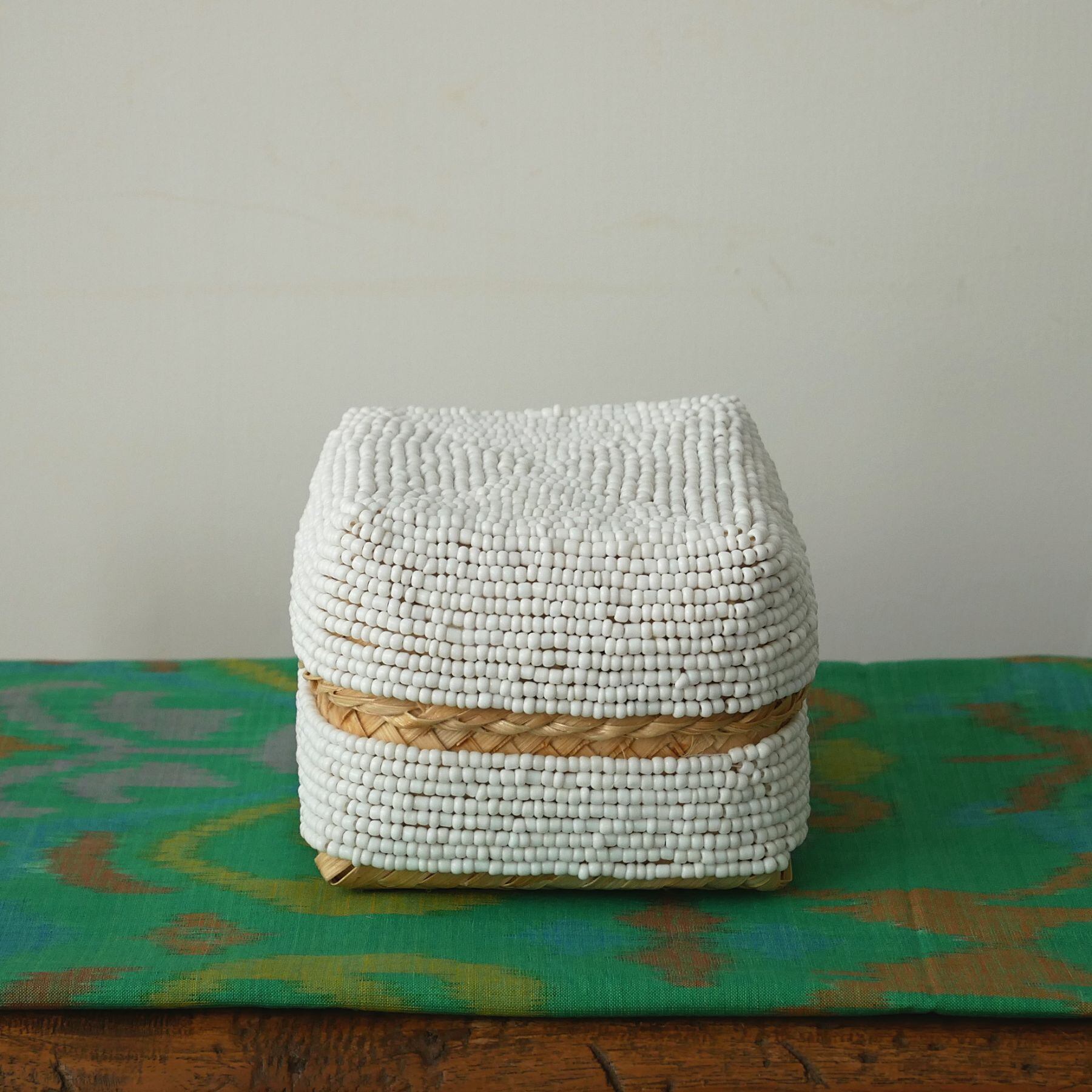 小さめサイズはちょっとしたお土産やアクセサリー入れなどに。びっしりビーズが縫い付けられていて、インテリアにも映えるこのソカシ。白一色で、シンプルなだけにビーズが繊細に際立っています。好きな家具や布との組み合わせも自在にできそう。